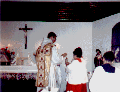 |  | Até que uma das famílias conseguiu do condomínio onde morava a permissão para celebrar a Santa Missa no salão de festas do condomínio, domingo de manhã. O local era relativamente digno, e rapidamente organizou-se uma capelinha portátil. Assim começou, num prédio do bairro de Santa Rosa, dia 8 de dezembro de 1991, festa de Nossa Senhora da Conceição, a Capela que recebeu a Virgem Imaculada por padroeira. |